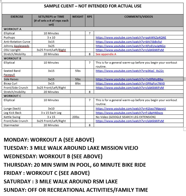 Receive a customized fitness program (sample below) based on specifics discussed during the phone consultation as well as access to outdoor parks, walking paths, tracks. Receive nutritional guidance, support and feedback weekly from our Nutritionist/Owner Dan Tatro, M.S.
